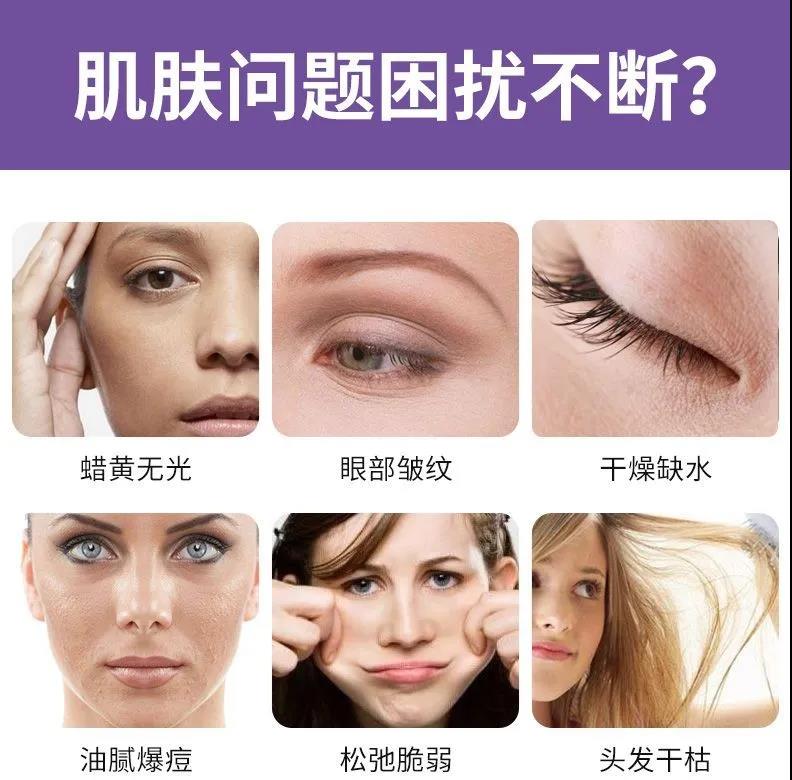 皮膚真皮層中75%是膠原蛋白,隨著年齡的增長膠原蛋白流失,膠原纖維斷裂,皺紋增加,皮膚干燥、易敏感、彈性嚴重下降、角質粗糙、毛孔粗大、出油明顯、色斑嚴重。